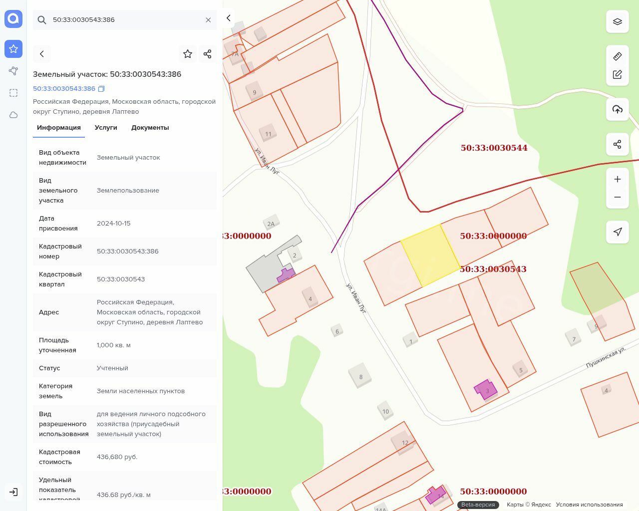 Местонахождение имущества: обл Московская, г.о. Ступино, д Лаптево Российская Федерация, Московская область, городской округ Ступино, деревня Лаптево Категория объекта: Земли населенных пунктов Форма собственности: Государственная собственность (неразграниченная)