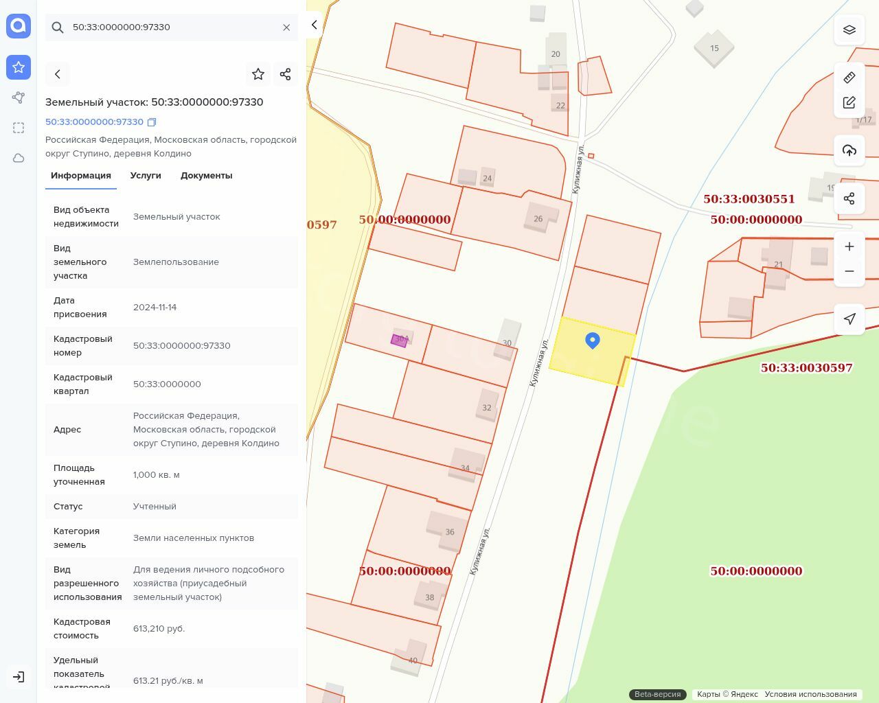 Местонахождение имущества: обл Московская, г.о. Ступино, д Колдино Российская Федерация, Московская область, городской округ Ступино, деревня Колдино Категория объекта: Земли населенных пунктов Форма собственности: Государственная собственность (неразграниченная)