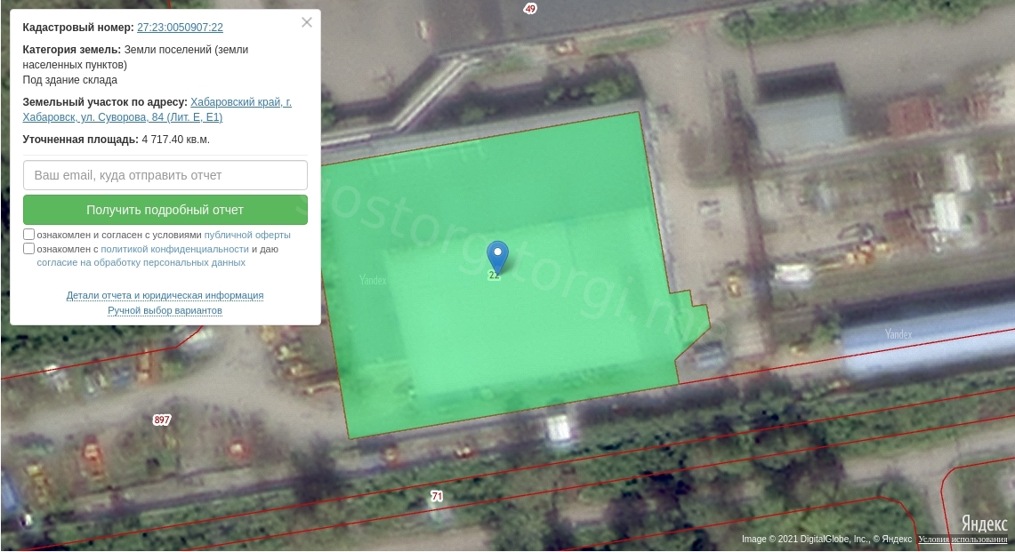 Земельный участок с кадастровым номером 27:23:0050907:22, площадью 4717,4 кв.м., под здание склада Адрес: г. Хабаровск, ул. Суворова, д. 84, лит. Е, Е1