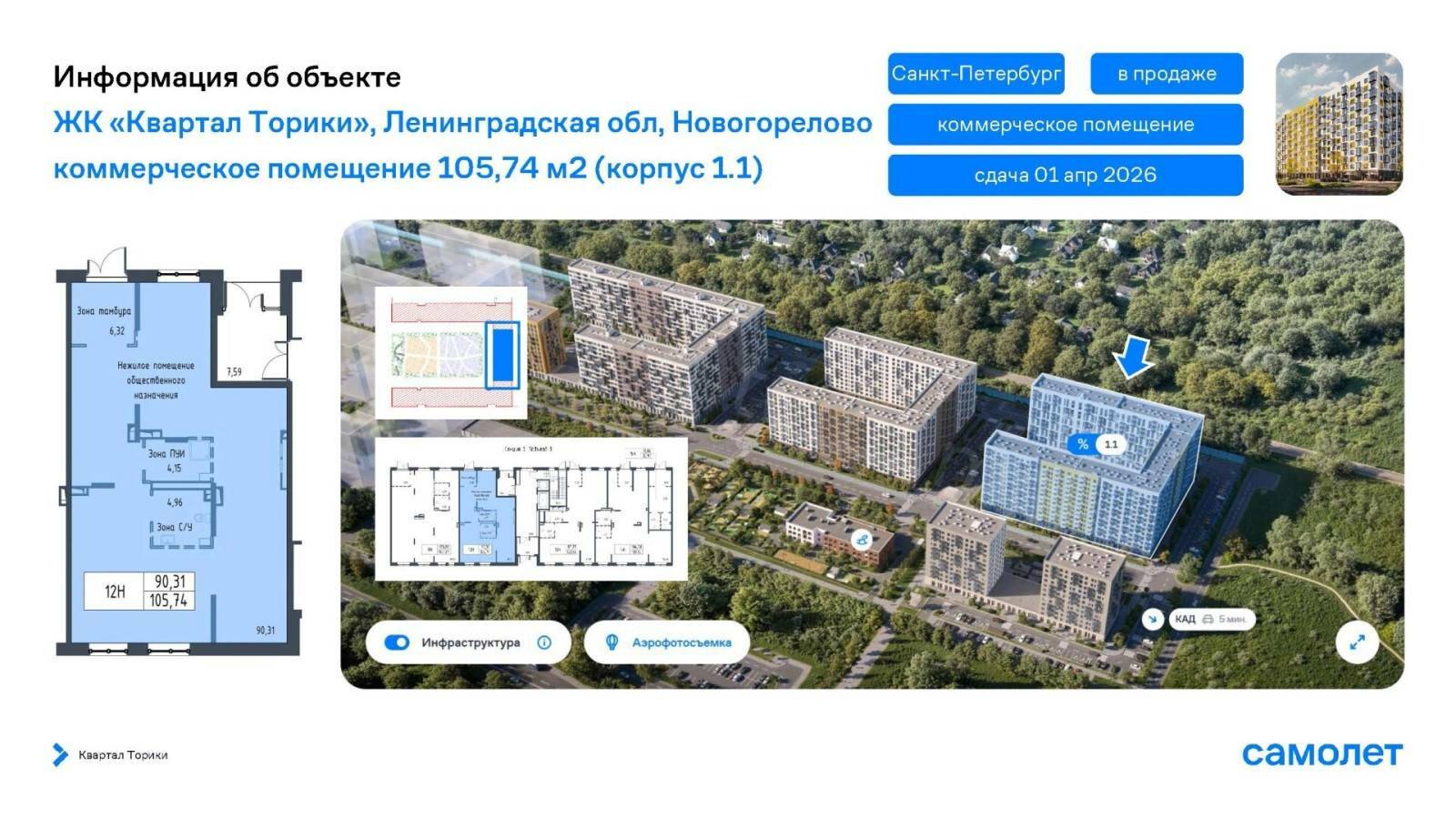 Продажа коммерческого помещения 105,74 м2 в ЖК Квартал Торики (Санкт-Петербург, Новогорелово). Коммерческое помещение свободного назначения 105,74 м2 в ЖК Квартал Торики (Санкт-Петербург, Новогорелово)