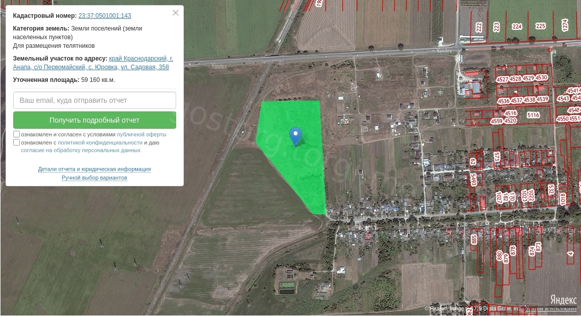 Лот №1 Земельный участок, площадью 59160 кв.м., кадастровый номер 23:37:0501001:143; Здание телятника, площадью 448,8 кв.м., кадастровый номер 23:37:0501001:4268; Здание телятника, площадью 851,5 кв.м., кадастровый номер 23:37:0501001:4269; Здание телятника, площадью 696,2 кв.м., кадастровый номер 23:37:0501001:4270