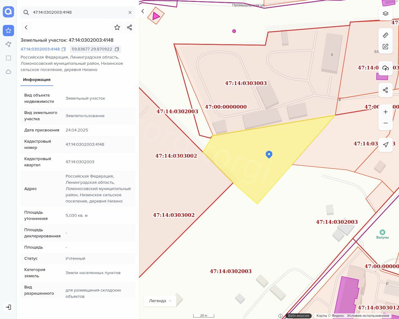 Земельный участок с кадастровым номером 47:14:0302003:4148, местоположение: Российская Федерация, Ленинградская область, Ломоносовский муниципальный район, Низинское сельское поселение, деревня Низино, площадью 5030 кв.м, разрешенное использование – для размещения складских объектов; категория земель – земли населенных пунктов.