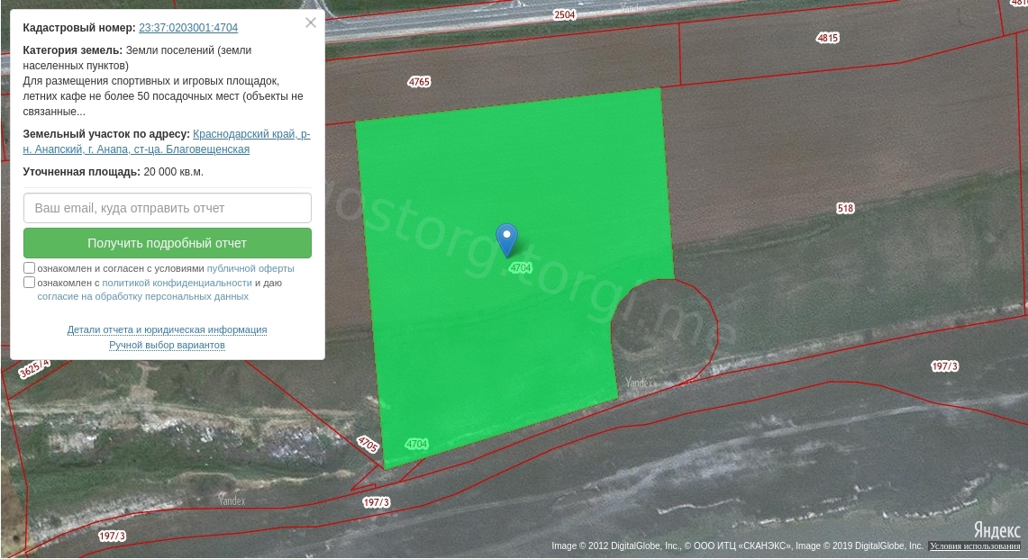 Лот №1 Земельный участок (для размещения спортивных площадок, летних кафе, торговых павильонов (не связанных со строительством) Площадь: 20000+/-49 м кв. Кадастровый номер: 23:37:0203001:4704