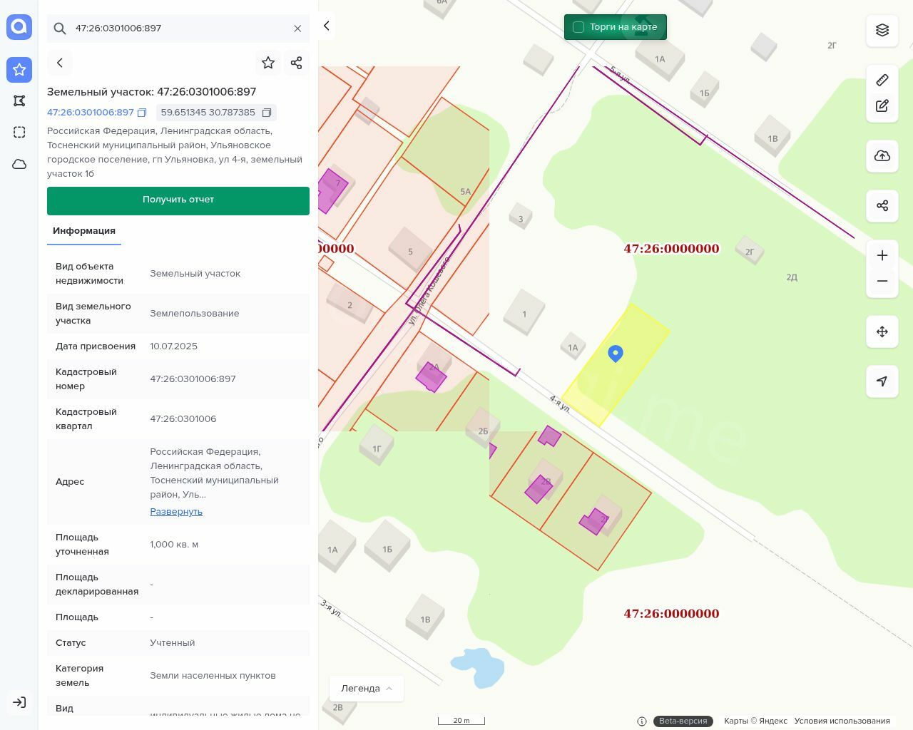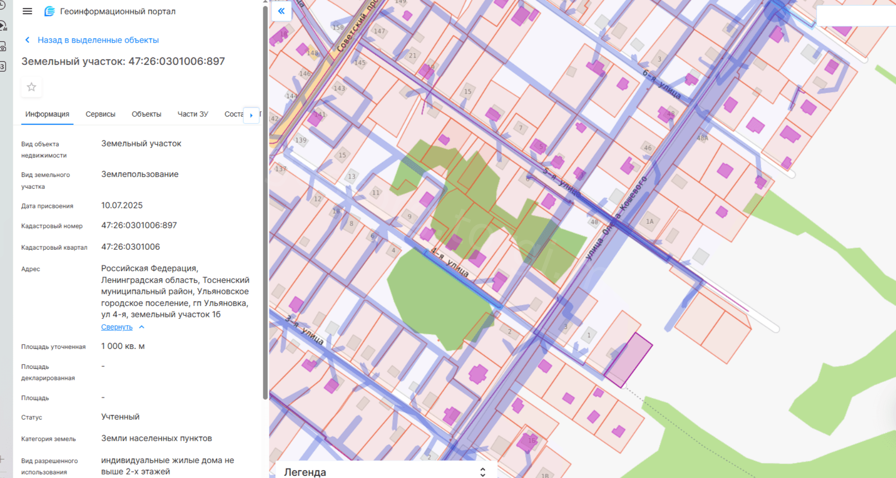 Местонахождение имущества: обл Ленинградская, м.р-н Тосненский, г.п. Ульяновское, гп Ульяновка, ул 4-я, з/у 1б Категория объекта: Земли населенных пунктов Форма собственности: Государственная собственность (неразграниченная)