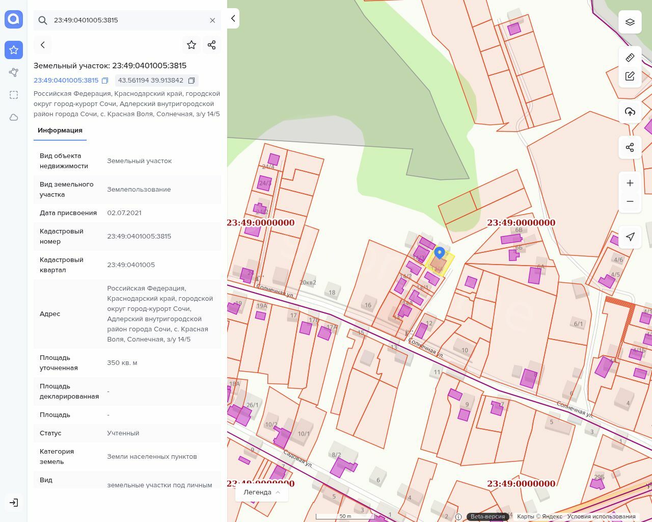 Земельный участок, (23:49:0401005:3815); Адрес: Российская Федерация, Краснодарский край, городской округ город-курорт Сочи, Адлерский внутригородской район города Сочи, с. Красная Воля, Солнечная, з/у 14/5