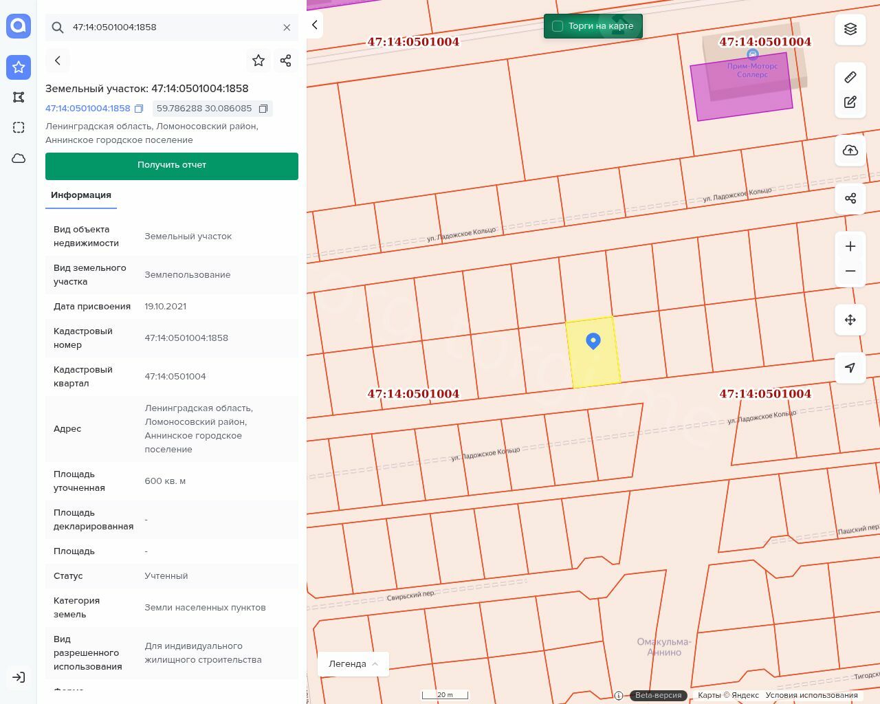 Земельный участок, общей площадью 600 кв.м, Аннинское городское поселение, кадастровый номер 47:14:0501004:1858,
