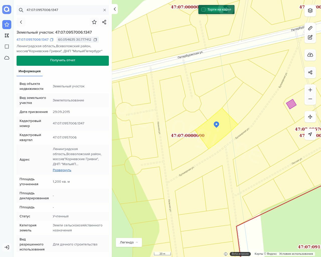 Земельный участок, категория земель: Земли сельскохозяйственного назначения, общей площадью 1200 +/- 24 м2, кадастровый (условный) номер: 47:07:0957006:1347