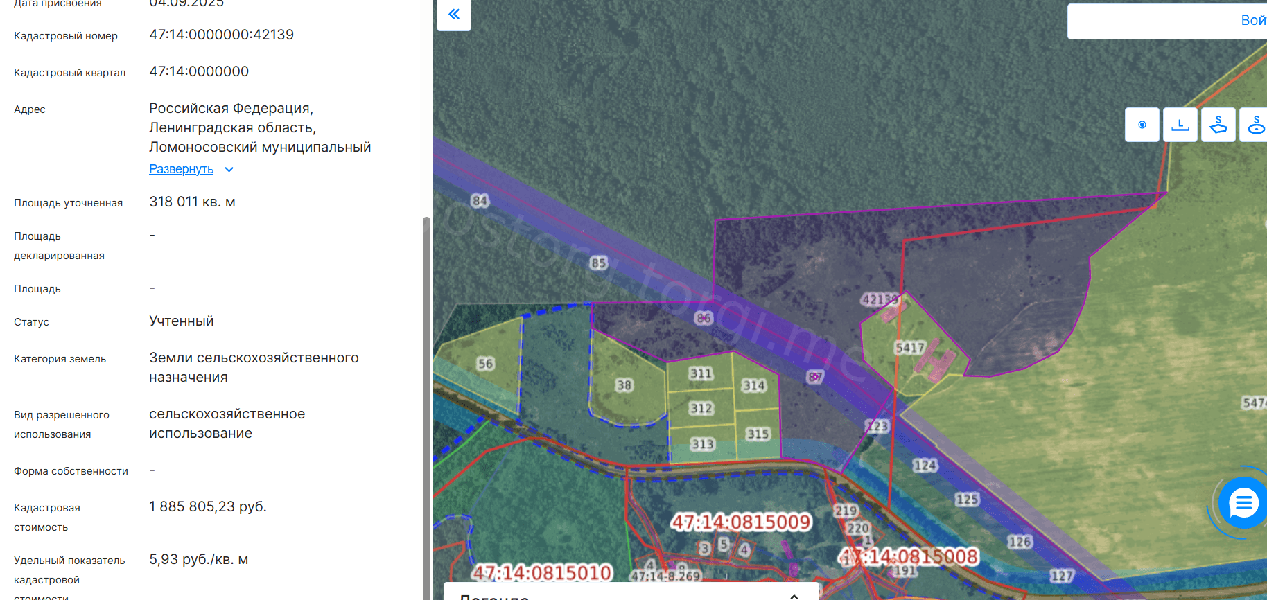 Вид разрешённого использования земельного участка: Животноводство Кадастровый номер земельного участка: 47:14:0000000:42139 Площадь земельного участка: 318011 м^2