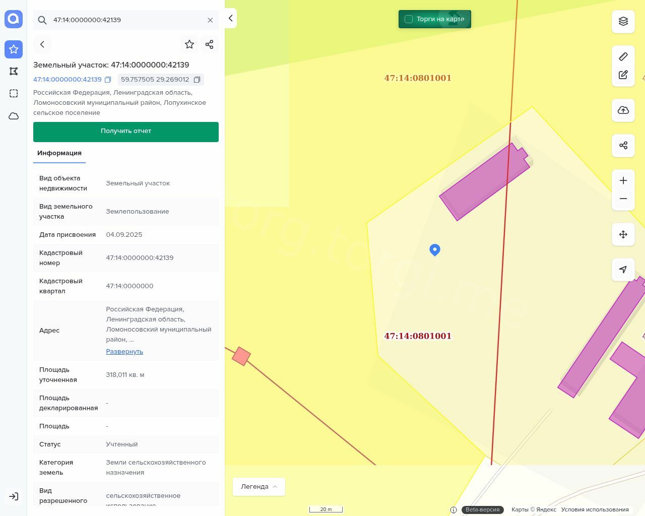 Земельный участок с кадастровым номером 47:14:0000000:42139, местоположение: Российская Федерация, Ленинградская область, Ломоносовский муниципальный район, Лопухинское сельское поселение, площадью 318011 кв.м, разрешенное использование – сельскохозяйственное использование (экспликация по угодьям – пастбище, культурное); категория земель – земли сельскохозяйственного назначения. Сх 1 – зона сельскохозяйственных угодий.