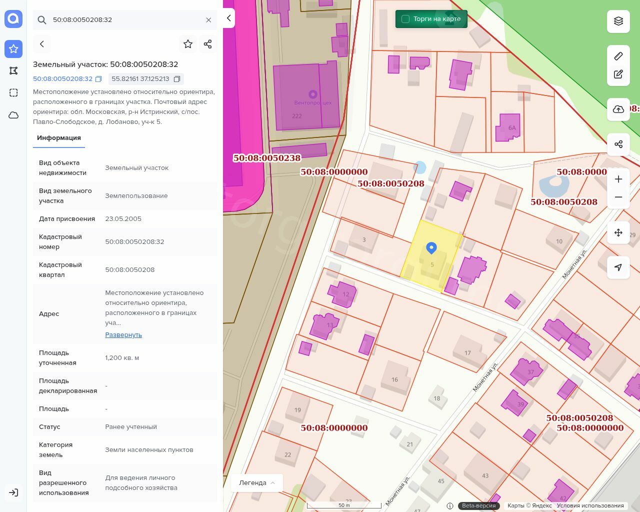 Жилой дом, 2007 года постройки, кадастровый номер 50:11:0000000:24093, общей площадью 550 кв.м., этажность "2"; Земельный участок, кадастровый номер 50:08:0050208:32, общей площадью 1 200 кв.м., категория земель "Земли населенных пунктов", вид разрешенного использования "Личное подсобное хозяйство (ЛПХ)"