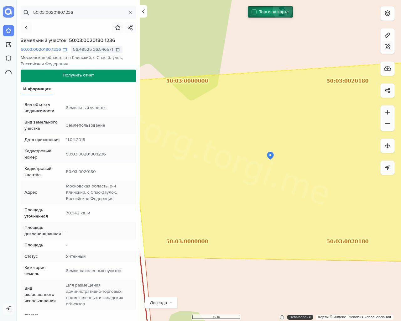 Земельный участок, категория земель: земли населенных пунктов, общая 70942 +/- 93 кв.м., кадастровый номер: 50:03:0020180:1236.