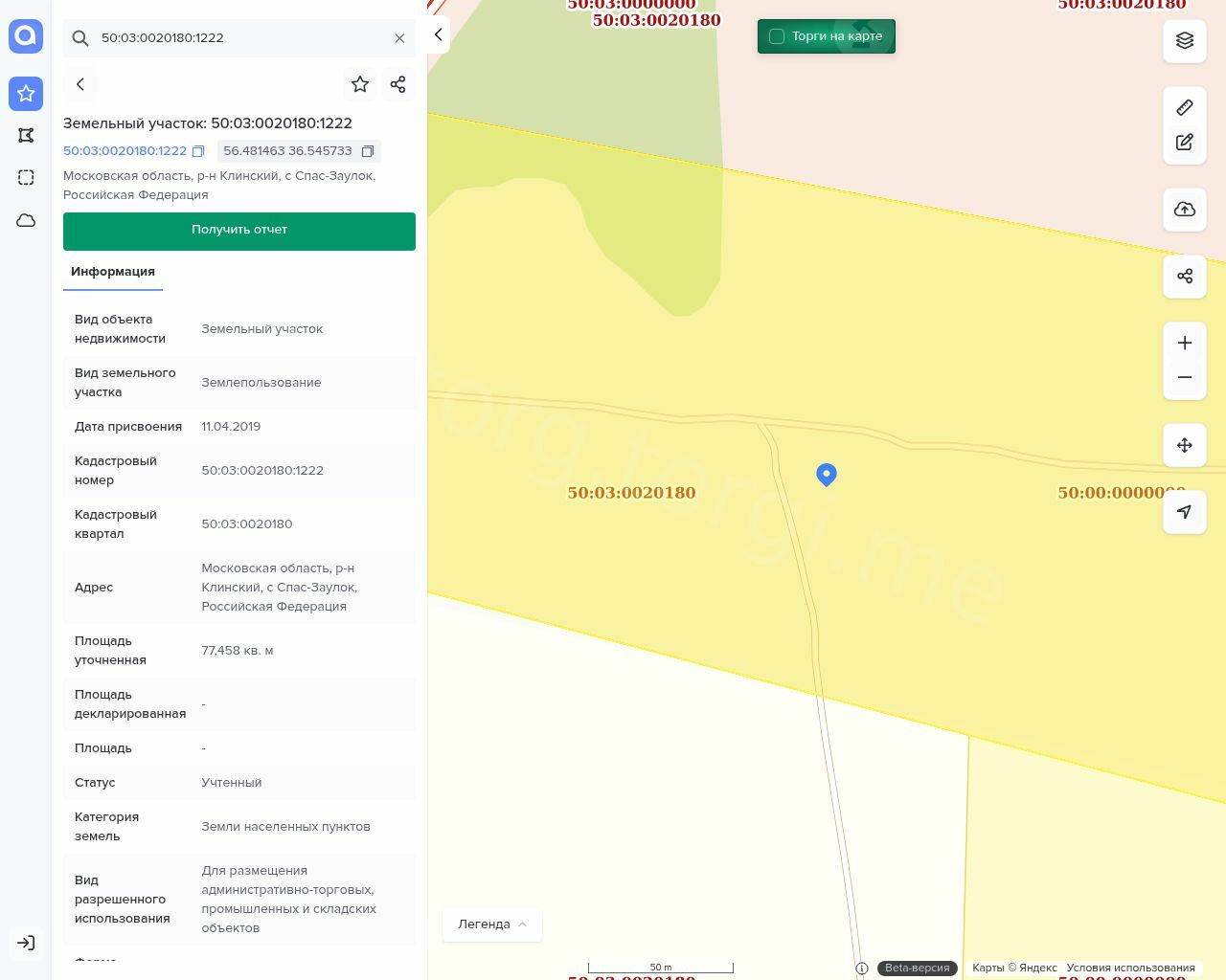 Земельный участок, категория земель: земли населенных пунктов, общая площадь 77 458 +/-97 кв.м., кадастровый номер: 50:03:0020180:1222.