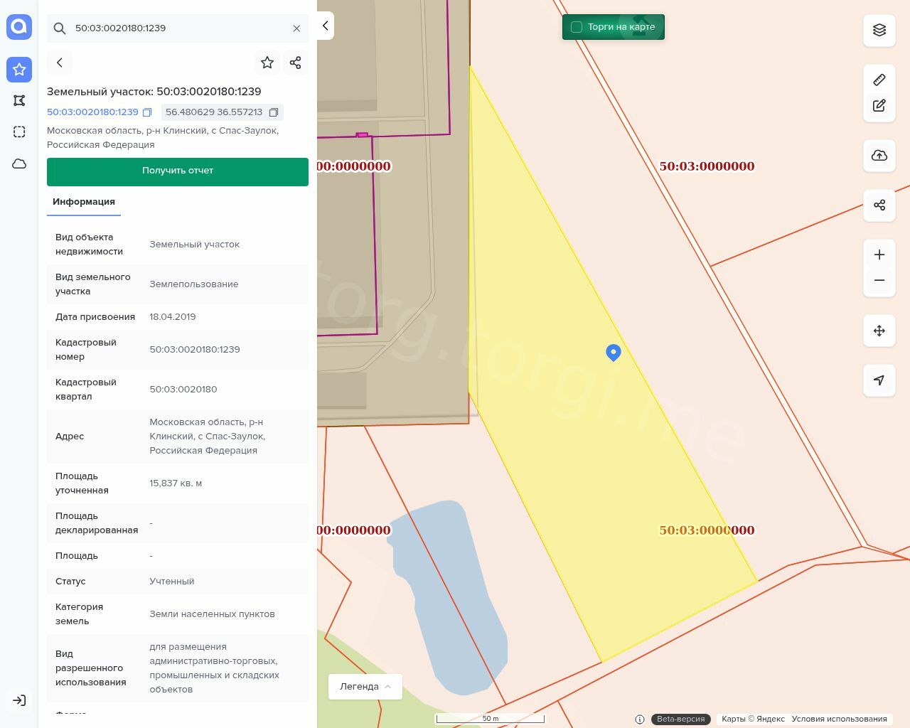 Земельный участок, кадастровый номер 50:03:0020180:1239, для размещения административно-торговых, промышленных и складских объектов, площадью 15 837 кв.м.