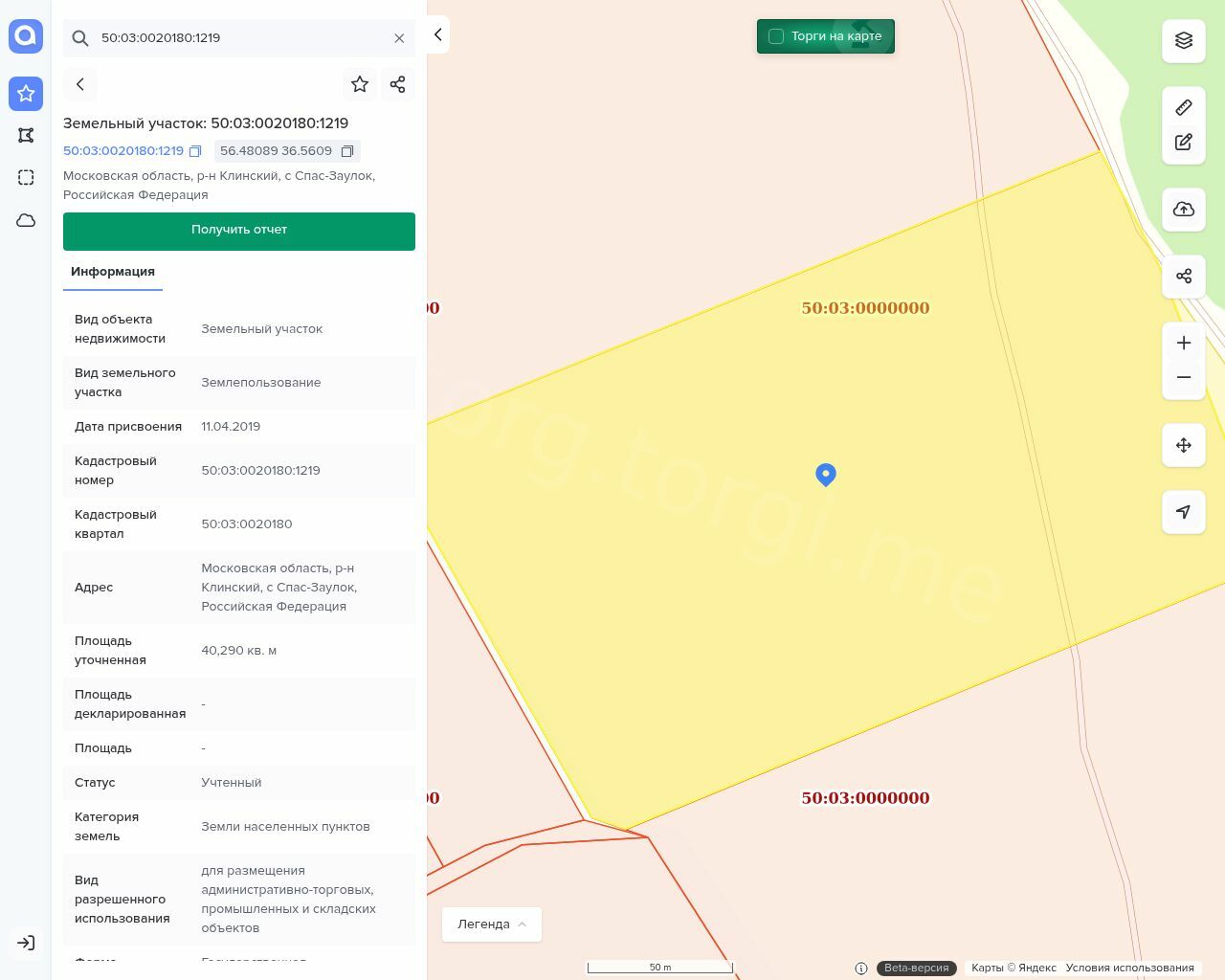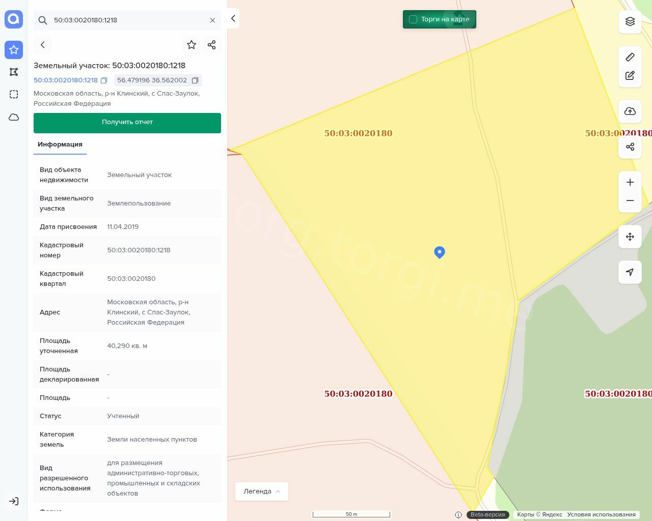 Земельный участок, кадастровый номер 50:03:0020180:1218 для размещения административно-торговых, промышленных и складских объектов, площадью 40 290 кв.м., Посредством данного земельного участка обеспечен доступ к земельному участку (земельным участкам) с кадастровым номером (кадастровыми номерами): 50:03:0020180:1219.