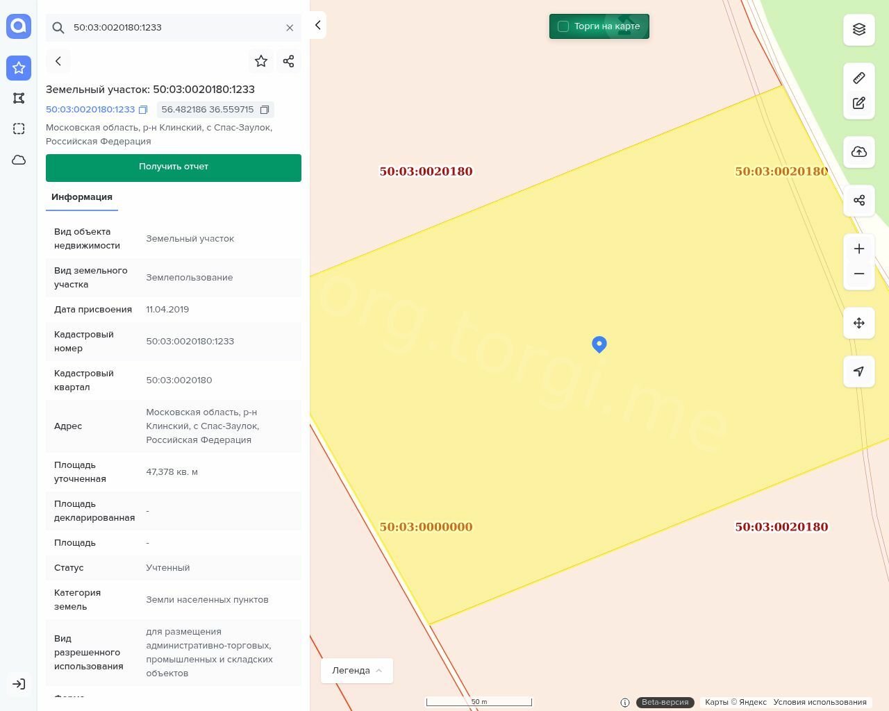 Земельный участок, кадастровый номер 50:03:0020180:1233 для размещения административно-торговых, промышленных и складских объектов, площадью 47 378 кв.м.