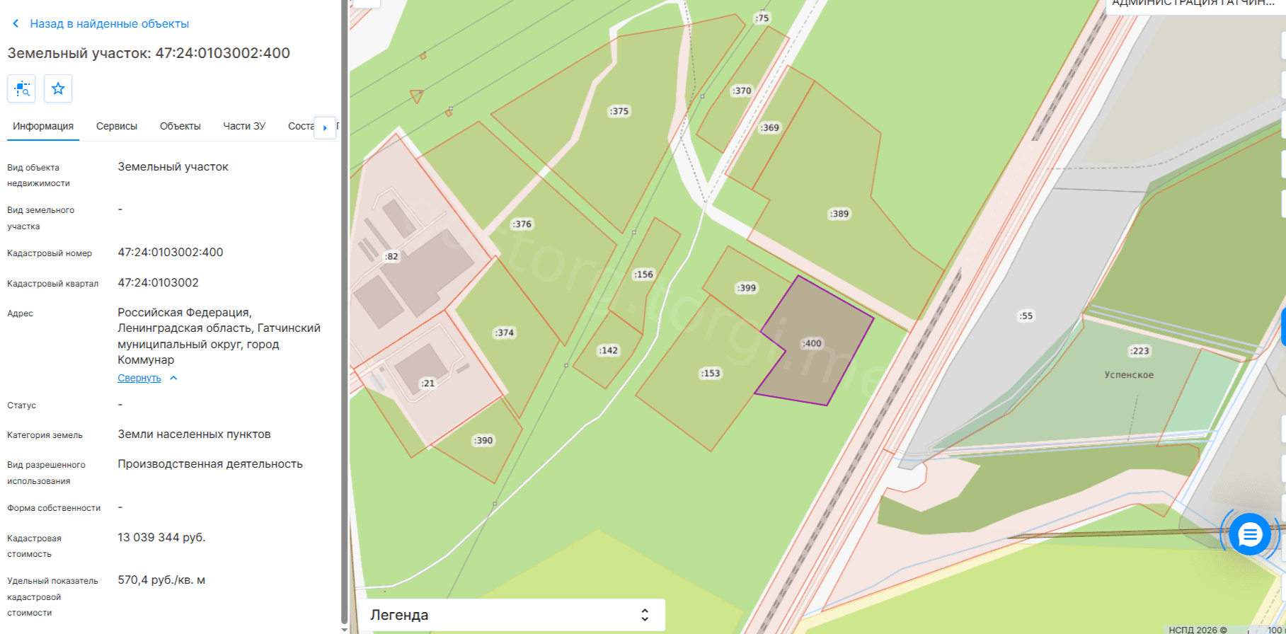 Вид разрешённого использования земельного участка: Производственная деятельность Кадастровый номер земельного участка: 47:24:0103002:400 Площадь земельного участка: 22860 м^2