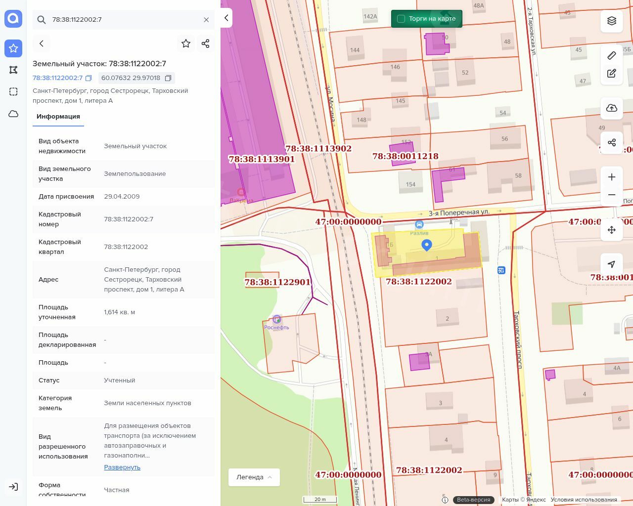 1. Нежилое здание. Адрес: Санкт-Петербург, город Сестрорецк, Тарховский проспект, дом 1, литера А. Назначение: Нежилое. Наименование: гараж. Площадь: 401.9 кв. м. Кадастровый номер: 78:38:1122002:9. Количество этажей, в том числе подземных этажей: 1, в том числе подземных 0. 2. Нежилое здание. Адрес: Санкт-Петербург, город Сестрорецк, Тарховский проспект, дом 1, литера Б. Назначение: Нежилое. Наименование: склад. Площадь: 100,1 кв. м. Кадастровый номер: 78:38:1122002:10. Количество этажей, в том числе подземных этажей: 1, в том числе подземных 0. 3. Земельный участок. Адрес: Санкт-Петербург, город Сестрорецк, Тарховский проспект, дом 1, литера А. Площадь: 1 614 +/- 14 кв. м. Кадастровый номер: 78:38:1122002:7. Категория земель: земли населенных пунктов. Виды разрешенного использования: Для размещения объектов транспорта (за исключением автозаправочных и газонаполнительных станций, предприятий автосервиса, гаражей и автостоянок).