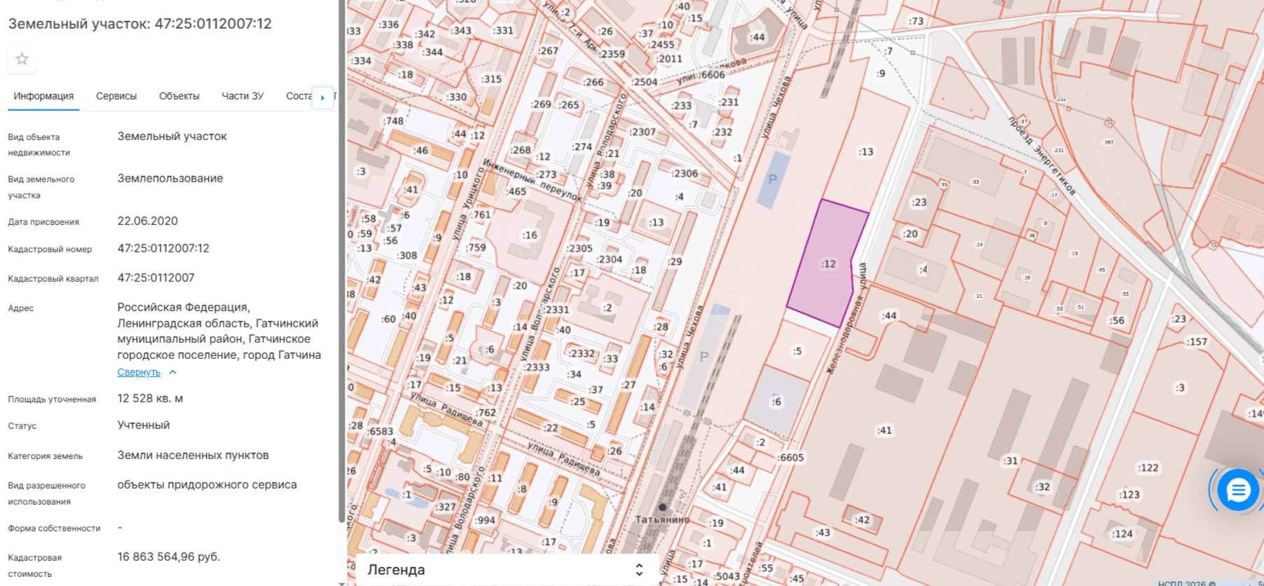 Земельный участок с кадастровым номером 47:25:0112007:12, площадью 12528 (двенадцать тысяч пятьсот двадцать восемь) кв.м., расположенный по адресу: Российская Федерация, Ленинградская область, Гатчинский муниципальный район, Гатчинское городское поселение, город Гатчина. Категория земель: земли населенных пунктов. Разрешенное использование: объекты придорожного сервиса. Граница земельного участка установлена в соответствии с требованиями земельного законодательства. Сведения об обременениях: - смотри "Извещение" + градостроительный план, размещенные в разделе "Документы".