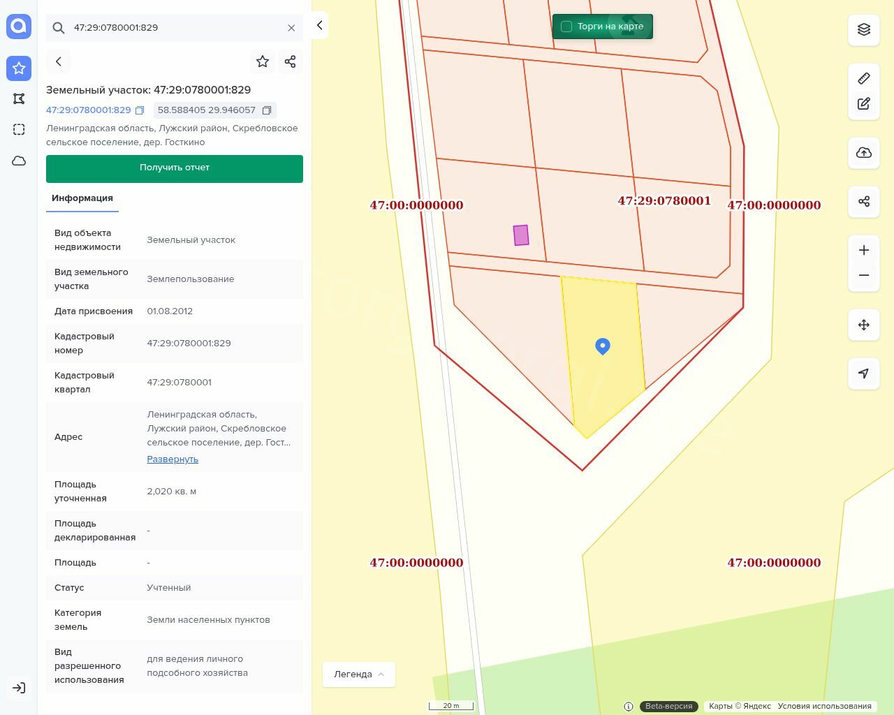 Лот №1 – Земельный участок, площадью 2020 кв.м., с кадастровым номером: 47:29:0780001:829.